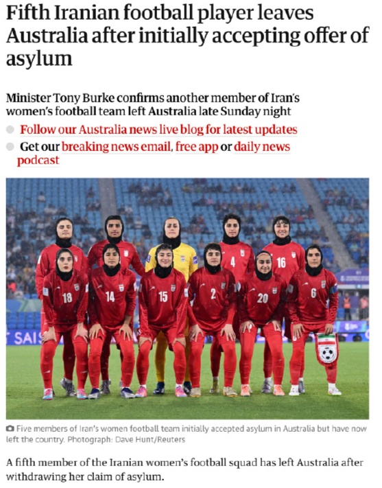 而在甘巴里之前,已经有4位与她一样一度“逃离”球队,申请留在澳大利亚的伊朗女足成员,最终却选择反悔,重新踏上回国之路。